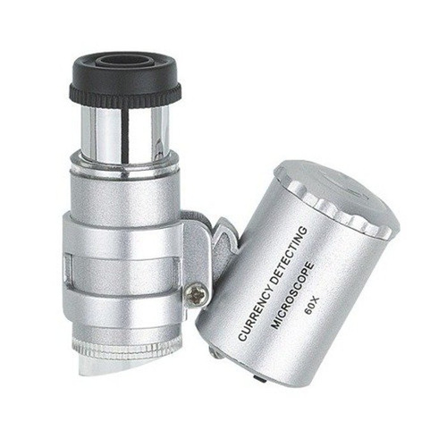Mini mikroskop kieszonkowy - powiększenie 60 x, z regulacją ostrości, z podświetleniem: 2 x LED i 1 x UV LED. Etui w komplecie.